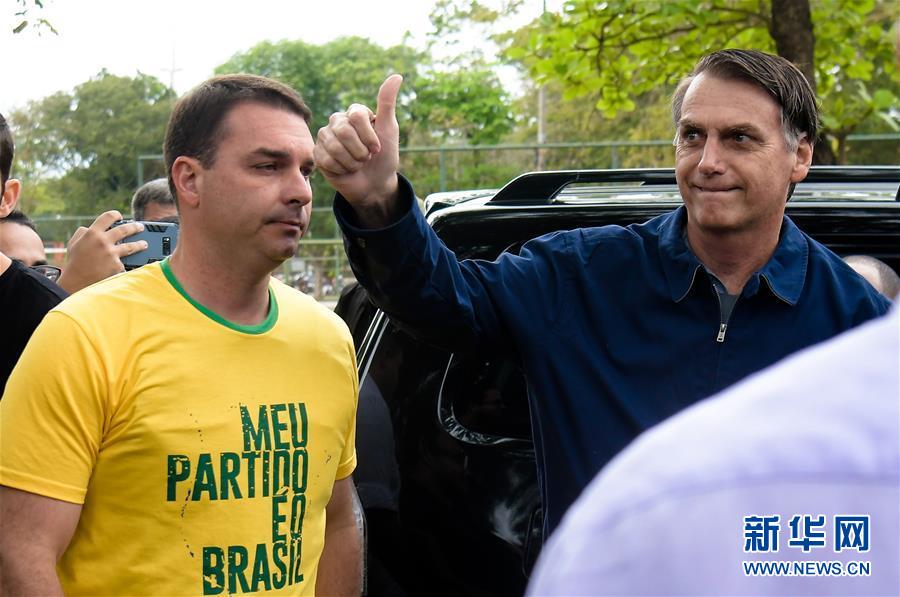 10月7日,在巴西里约热内卢,巴西总统候选人博尔索纳罗(右)到达投票站。巴西总统选举投票当地时间7日8时开始。据了解,投票将于当地时间17时结束,计票结果预计于当晚