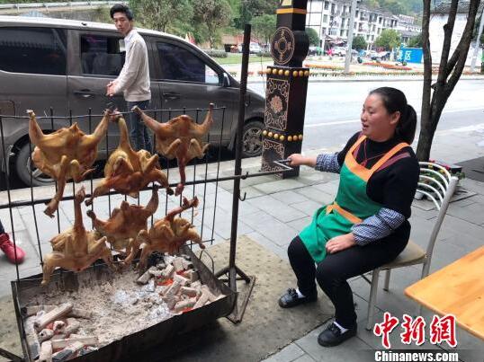 光雾山镇村民吴琴在农家乐前烤鸡。 谢秋阳 摄