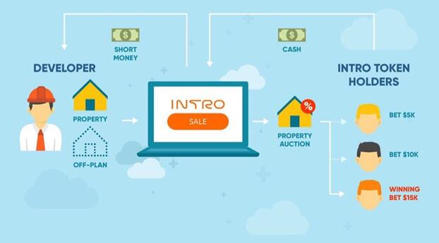 在INTRO销售市场中,中介取得根据开发商的价格选择房地产客体的权限—平均5-10%低于公开市场。为了可以交易,需要首先预定标的物,为此征收房子总价2-3%的定金。现今定金通过在公司注册地的所在国家的在线外汇收银处征收。以后INTRO的代币可以作为定金使用。