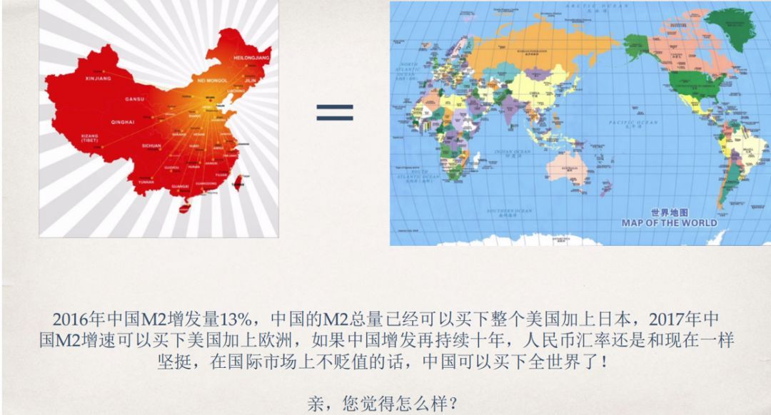 非常有的意思是,中国的M2货币流通量可以买下全世界。2016年的时候,中国的m2总量可以买下整个美国加日本的所有的GDP。2018年中国可以买下美国加所有欧盟国家的GDP总量。如果人民币继续保持现有的汇率,然后按照现在每年百分之八到十的M2增速这么印钱的话,在十年以后,中国的流通货币都可以把全世界的GDP全买下来。