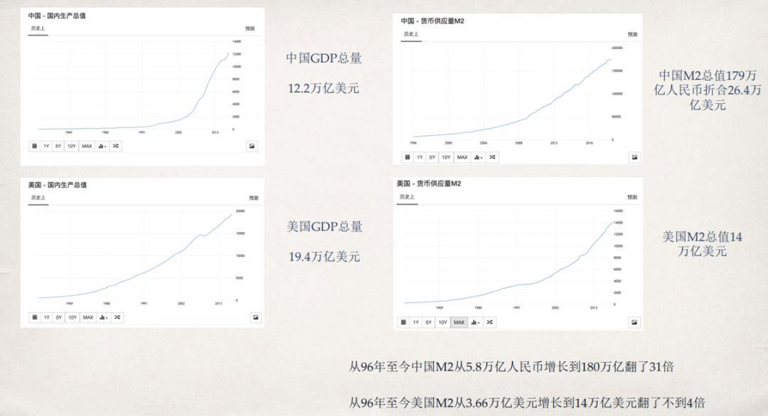 但是从中长期来看,需要看中国GDP总量和中国货币流通量M2的比值。中国GDP总量12.2万亿美元,m2的总量已经超过180万亿人民币,大概折合将近27万亿美元。也就是说,中国印两块多钱才能生产一块钱的东西。而相比较美国的GDP总量呢?今年已经突破二十万亿美元,但美国的M2总量只有十四万亿,美国差不多印七毛五就可以生产一美元东西。