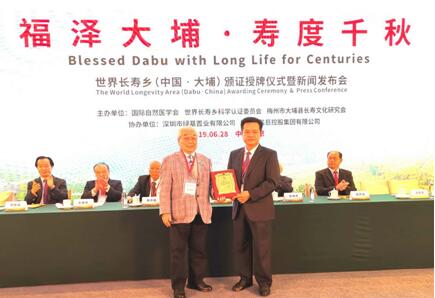 据悉,该活动由国际自然医学会、世界长寿乡科学认证委员会、梅州市大埔县长寿文化研究会共同主办。会上,国际自然医学会世界长寿乡调查团团长、世界长寿乡科学认证委员会主席森下敬一发表对大埔的长寿调查报告,宣布大埔为世界第八个长寿乡并颁发认证证书和授牌,大埔县委书记朱汉东接受牌匾;大埔县聘请森下敬一为大埔县经济社会发展战略顾问;大埔县长寿文化研究会会长袁光明公布获奖LOGO及宣传口号;此外,还举行了一批康养文旅项目的签约仪式。 全国人大代表邓振龙,海南省军区原副政委黄声云将军,中共梅州市委常委彭延虎,广东省老区建设促进会会长陈开枝,以及联合国世界旅游组织专家、亚太旅游协会中国专家委员会秘书长贾云峰;第六届全国政协委员,第七、八届全国政协常委邬沧萍分别作了讲话。
