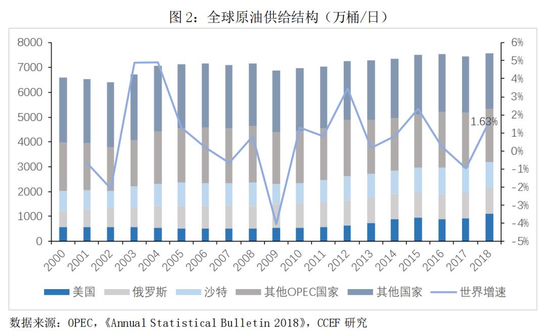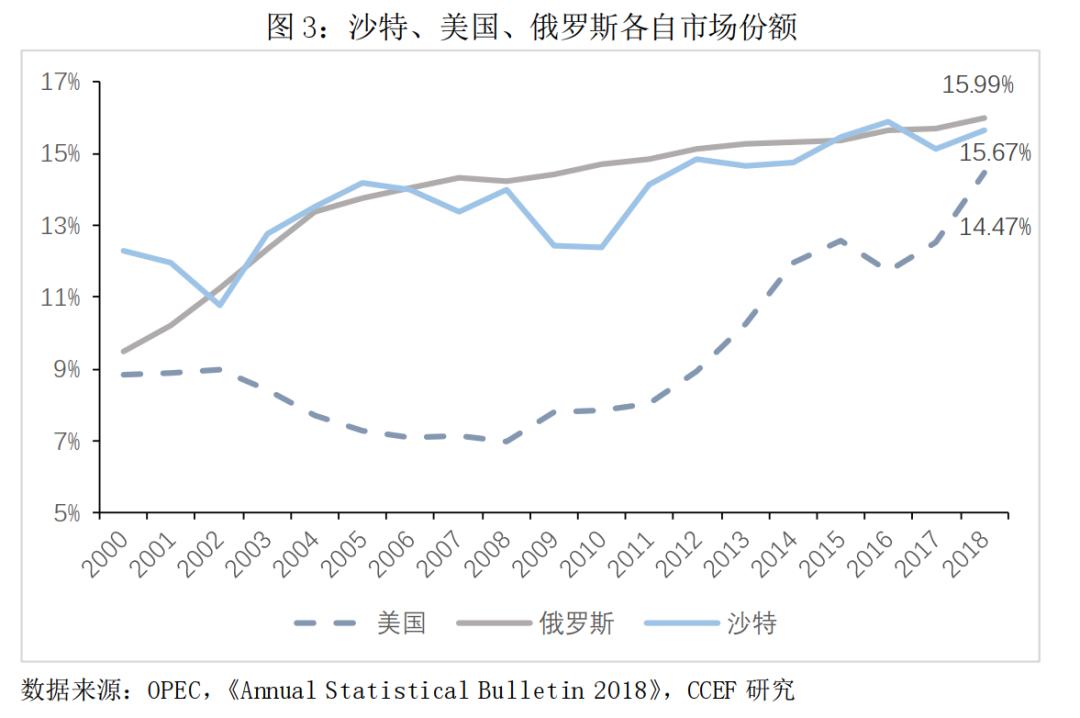 OPEC是世界最大的石油组织,其石油产量占全球原油市场总供给量的48.22%(2018年),其中作为OPEC组织主导国的沙特占15.67%。同为产油大国的俄罗斯市场份额在16%左右。从2000年至2018年俄罗斯与沙特阿拉伯各自市场份额变化看,双方一直在角逐最大石油输出国的宝座。