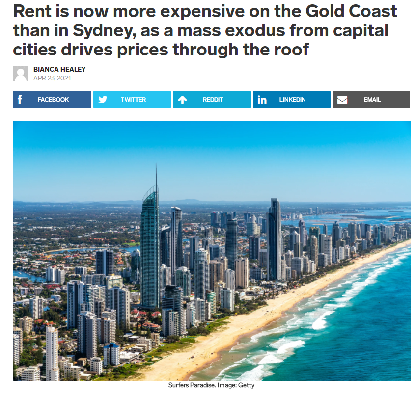Domain近日发布的3月房租报告称,在后疫情时代,随着大批澳人从州府城市撤离来到黄金海岸等地生活,现在黄金海岸的房租比悉尼还贵。