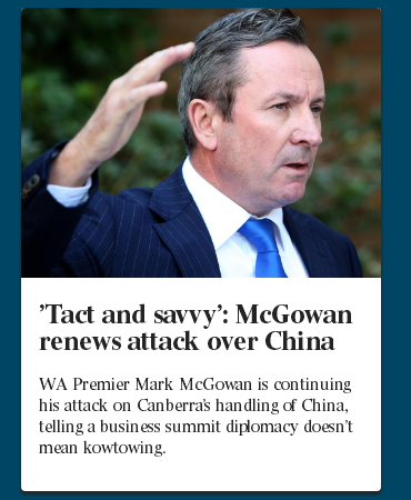 西澳州长麦高恩(Mark McGowan)15日敦促澳洲联邦政府停止与最大贸易伙伴中国的对抗。