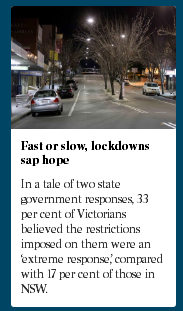 报告对2020年3月27日以来2万名澳人就疫情应对的反馈进行了调查,在面对新冠肺炎疫情的限制措施上,9%的受访维州人认为他们的新冠肺炎限制措施应该更严格,而新州的这一比例为48%。33%的受访维州人认为强加给他们的限制是一种“极端反应”,而新州的这一比例为17%。维州的大多数受访者(58%)认为政府的限制措施是合理的回应,而新州的这一比例为35%。