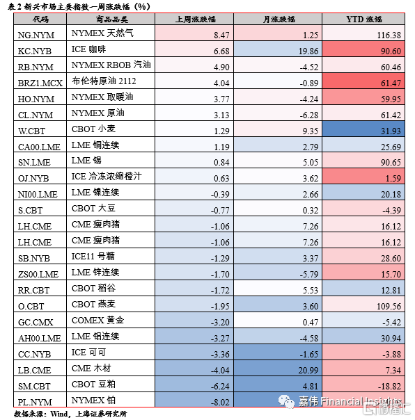 美国联合印度、日本等多个主要消费国释放战略储备,但并不及市场预期,抛储落地后,天然气和石油相关品种下跌幅度较大。基于消费国释放战略储备的行动,OPEC+主要产油国甚至表示要重新考虑后期增产问题,或有减小增产举动,但随着Omicron的出现,OPEC+有更多的不增产的理由。周跌幅较大的品种有:黄金、铝、可可、木材、豆粕、铂,但疫情恶化下,黄金以及其他贵金属的需求正在扩大。