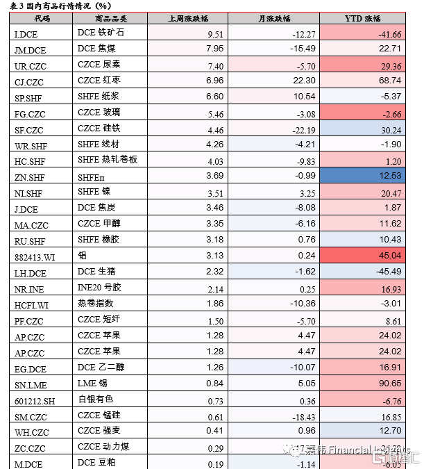 国内主要商品表现不一。其中,铁矿石表现最佳,累计上涨9.51%,其次为焦煤,上涨7.95%,铁矿石和焦煤上涨一方面由于市场对12月份钢厂复产存在较强预期,以及钢厂在低库存状态下存在补库需求,一方面受益于房地产市场预期的变化,市场情绪回暖支撑矿价反弹,但当前铁矿石仍延续供稳需弱格局,港口库存仍在进一步累库,在基本面未有改善的情况下矿价反弹高度有限,预计继续维持震荡为主;跌幅较大的品种有:螺纹钢、菜粕、花生、黄金、纯碱、棕榈油、白银、苯乙烯等。