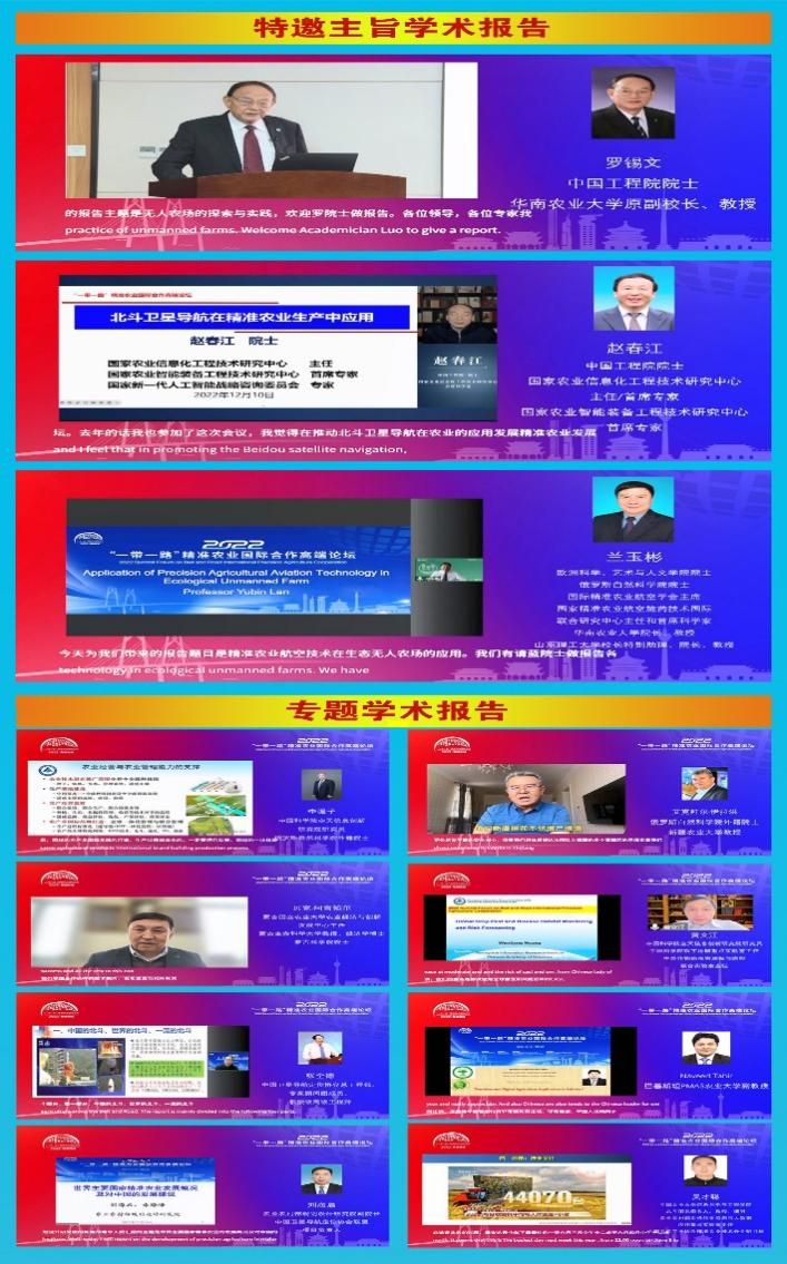 本次论坛邀请了中国工程院院士、华南农业大学原副校长、教授罗锡文,中国工程院院士、国家农业信息化工程技术研究中心主任/首席专家、国家农业智能装备工程技术研究中心首席专家赵春江,欧洲科学院院士、俄罗斯自然科学院外籍院士、华南农业大学教授兰玉彬作论坛主旨报告;中国科学院空天信息创新研究院研究员、俄罗斯自然科学院外籍院士李强子,俄罗斯自然科学院外籍院士、新疆农业大学教授艾克拜尔·伊拉洪,蒙古国立农业大学农业经济与创新发展中心主任、蒙古生命科学大学教授、蒙古科学院院士贝克·阿吉帕尔,中国科学院空天信息创新研究院研究员、中国科学院数字地球重点实验室主任、中英作物病虫害测报与防控联合实验室主任黄文江,中国卫星导航定位协会总工程师、教授级高级工程师张全德,巴基斯坦干旱农业大学副教授纳维德·塔希尔,农业农村部规划设计研究院副院长、中国卫星导航定位协会联盟项目负责人刘海启,中国农业大学信息与电气工程学院教授、农业农村部农机作业监测与大数据应用重点实验室主任吴才聪等作专题学术报告。