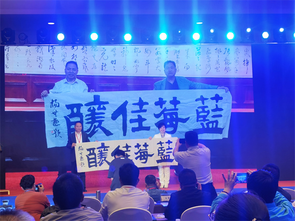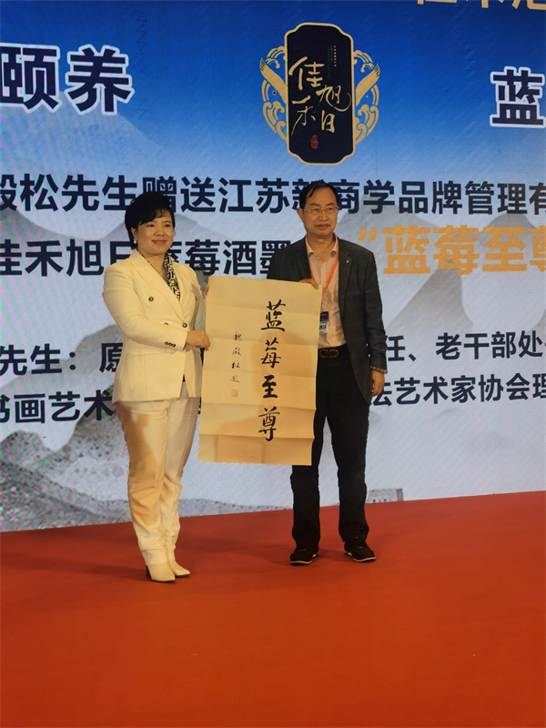国家艺术品高级鉴定评估师、国家高级美术师、著名书法家、画家、中国艺术节基金会传统文化书画院原院长杨无极,为江苏新商学品牌管理有限公司佳禾旭日蓝莓酒题写了“蓝莓佳酿”四个大字;原故宫博物院党办主任、老干部处书记,故宫紫禁城书画艺术协会理事、中国书法艺术家协会理事、书法家魏殿松老师,赠送了“蓝莓至尊”墨宝。