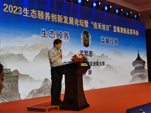 中国林业与环境促进会主席孟繁志代表主办方发表了热情洋溢的致辞,对参会的各位领导、嘉宾、朋友和中国林业与环境促进会的家人们表示热烈的欢迎。他在致辞中讲到,推动经济社会发展绿色化、低碳化是实现高质量发展的关键环节,为探索将生态康养与绿色农林产品相结合,发展生态环境“五度优势”(温度、湿度、空气洁净度、森林绿化度和农产品有机度) 的农林业产品,促进蓝莓产业发展,推动蓝莓深加工,研发与生产绿色、高附加值的蓝莓酒,助力乡村振兴,中国林业与环境促进会主办了本次论坛,我们倡导大力发展蓝莓酒等生态友好型产业,实现康养与生态产品相结合的创新性发展,全方位满足消费者的健康需求,加快推进生态颐养产业发展,为我国绿色生态发展作出更大贡献。