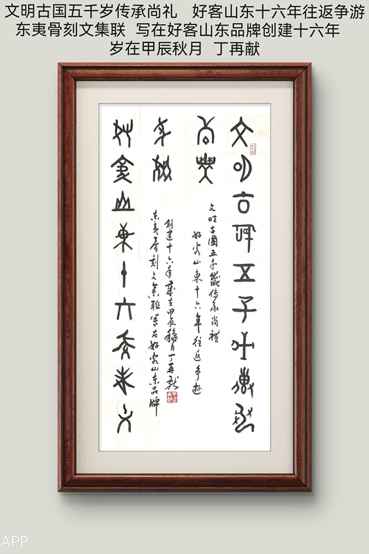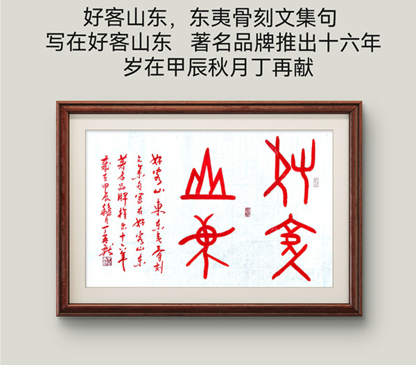 为此,著名文化学者、东夷骨刻文字系统破译者、骨刻文书法艺术创始人、国家一级书法家、“好客山东”品牌创立见证人、山东省旅游行业协会副会长丁再献先生,于甲辰秋月集东夷骨刻文,为著名“好客山东”品牌创建十六周年,创作撰写了一幅楹联书法作品: