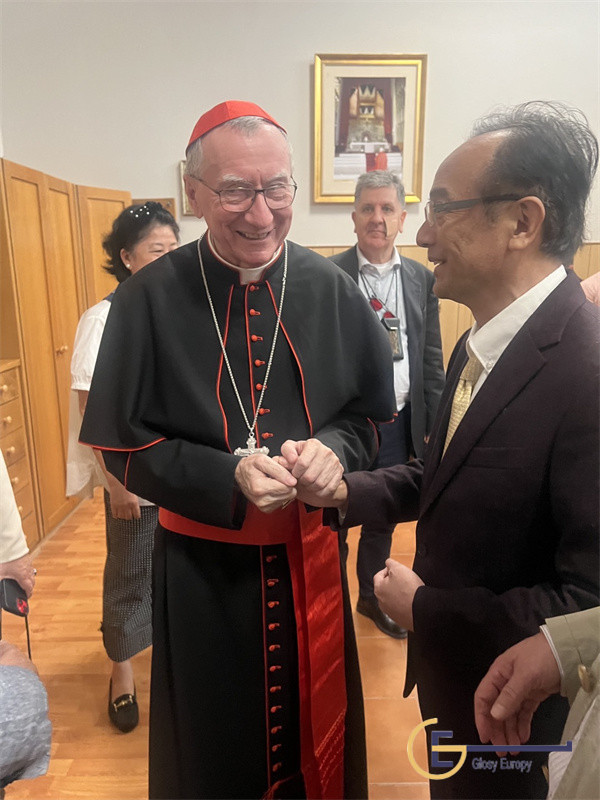 中国著名油画艺术家张焰先生(右一)与圣座国务卿帕罗林枢机(左一)合影留念。