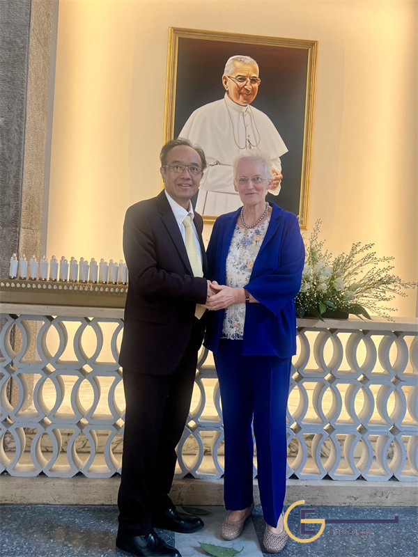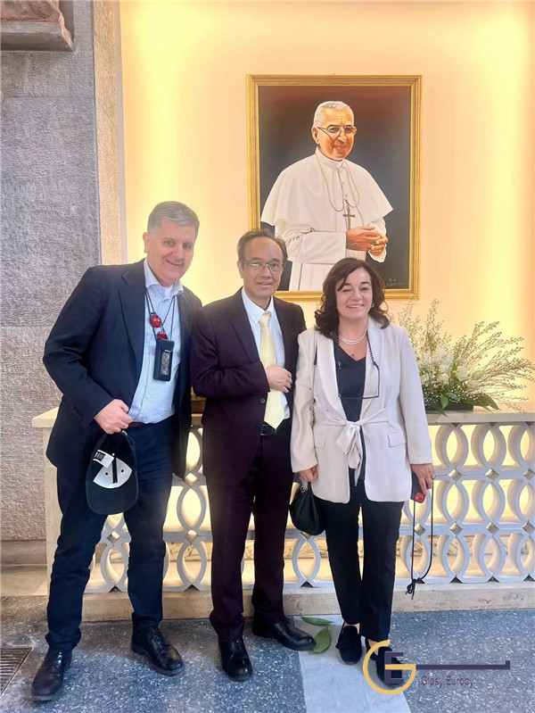 中国著名油画艺术家张焰先生(左一)与卢奇亚诺教宗的外甥女佩特里女士(右一)合影留念。