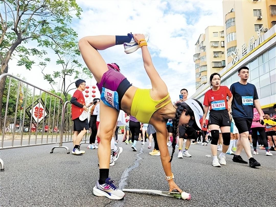 瑜伽教练刘焕霞完成半马后做起了高难度动作。郭永乐 摄