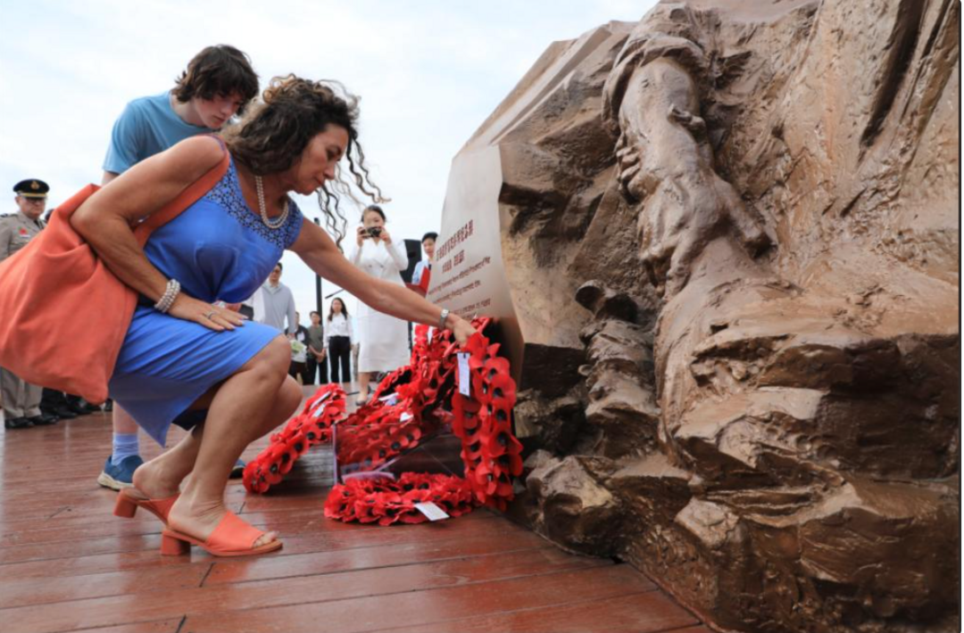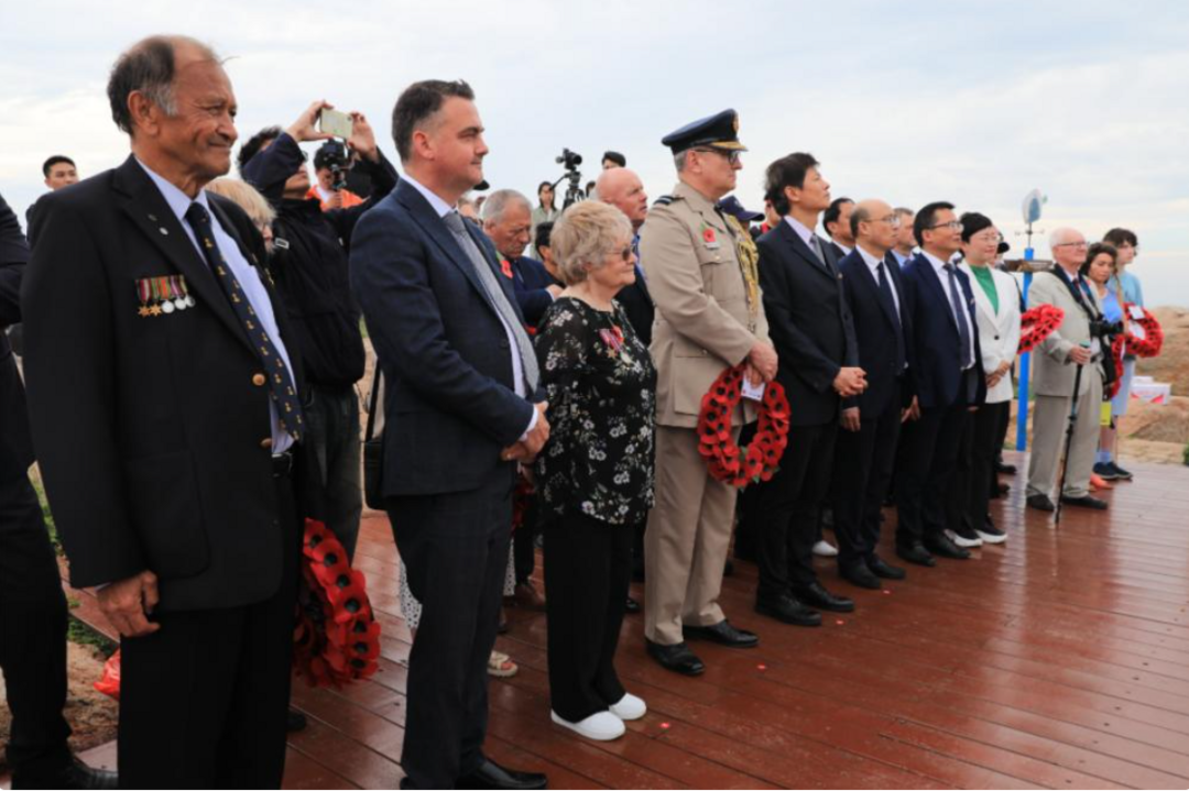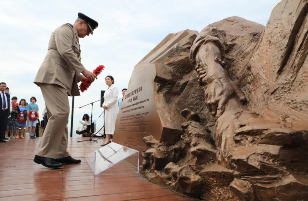 18位到场见证纪念碑揭幕的英军亲历者后代一一敬献花圈(见图)。“里斯本丸”事件遇难者约翰·韦弗的侄女林赛泪流满面:“我们用虞美人花纪念在战争中丧生的士兵,我用它永远地怀念我的叔叔。”