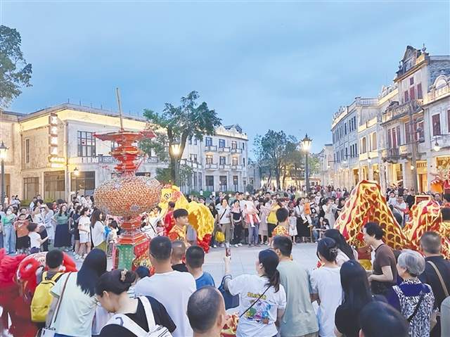走进赤坎华侨古镇,淘金大道的热闹场景总能瞬间点燃游客情绪。跟着“丐帮主理人”唱首歌、跳支舞,就能赢得颇具年代感的“银票”;化身“警员”跟着警长巡逻,或是体验车夫、零工等老侨乡职业,沉浸式感受侨镇旧时光。“我女儿背了几页《三字经》就赢了不少‘银票’奖品,全程兴奋得不行,这种互动太有意义了。”游客陈女士的感慨,道出了众多游客的心声。