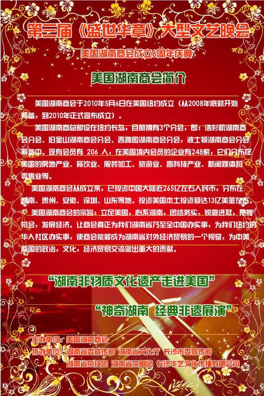 第三届《盛世华章》大型文艺晚会的主题为“湖南非物质文化遗产走进美国”,由美国湖南商会主办,由湖南省委宣传部、湖南省文化厅、长沙市委宣传部、湖南省杂技团、湖南省京剧团、长沙华艺文化传播有限公司协办,此次晚会也得到国会众议员孟昭文办公室、纽约市议员顾雅明办公室以及纽约中华歌舞团等其他机构与个人的大力支持。
