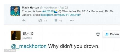 在400米颁奖典礼之后,霍顿先是在轻博客上放了一张自己带着金牌的照片,还加上“我来自澳大利亚。”的文本描述,意指澳洲是传统游泳强国之后。立刻成为了刺激中国网友神经的导火索,其中一位回复:“你永远都是屌丝...向孙杨道歉!”
