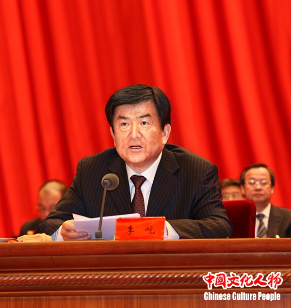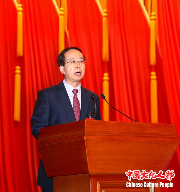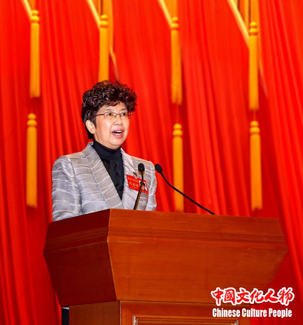 中国文联党组书记、副主席赵实作题为《肩负时代新使命 推动文艺新发展 为实现中华民族伟大复兴中国梦贡献力量》的工作报告 中新社发 王保胜 摄