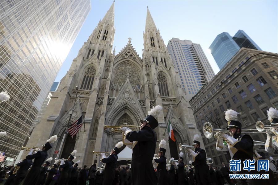 3月17日,在美国纽约曼哈顿,圣帕特里克节的游行队伍从圣帕特里克大教堂前经过。当天,第256届圣帕特里克节大游行在美国纽约第五大道举行,吸引数万人观看。每年3月17日的圣帕特里克节是爱尔兰传统节日,为纪念爱尔兰守护神圣帕特里克而设立。美国的爱尔兰后裔在这一天喜欢佩戴三叶草,用爱尔兰国旗颜色黄绿两色装饰房间,身穿绿色衣服,并向宾客赠送三叶草饰物等。