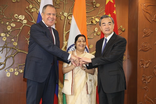 当地时间2017年12月11日,外交部长王毅在印度新德里出席中俄印外长第十五次会晤。中国外长王毅的手昨天在新德里与印度外长斯瓦拉吉的手握在了一起,印方说两人会谈
