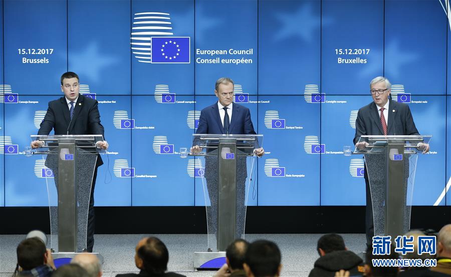 12月15日,在比利时首都布鲁塞尔,欧盟现任轮值主席国爱沙尼亚总理拉塔斯(左)、欧洲理事会主席图斯克(中)和欧盟委员会主席容克出席新闻发布会。新华社记者叶平凡摄