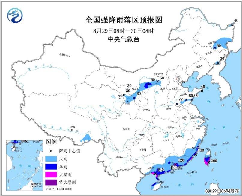 据中央气象台网站消息,中央气象台8月29日06时继续发布暴雨蓝色预警。预计8月29日08时至30日08时,黑龙江东部、吉林东南部、内蒙古西南部、宁夏北部、甘肃中西部、