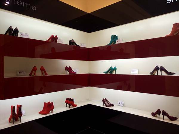 陈列各民族元素鞋的专柜,其设计灵感来自各民族纹案。两位蜀绣绣娘进行纹案的刺绣操作。中新四川网5月10日电 (胡敏汤雁)56个民族图腾、56种民族纹案,古老文明与现