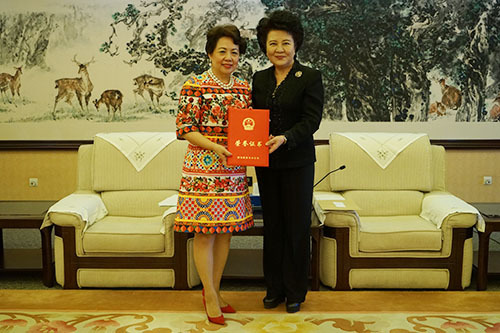 国侨办主任裘援平向邓慕莲颁发荣誉证书。(付强摄)中新社北京12月27日电(付强)国务院侨办主任裘援平27日在北京会见香港知名慈善家邓慕莲并颁发荣誉证书,感谢她多年