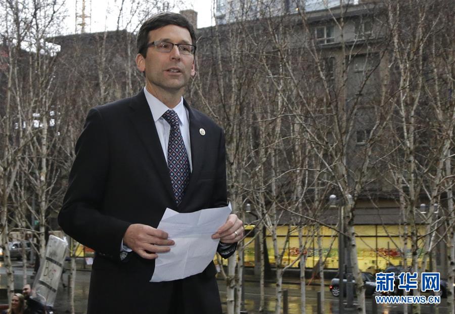 2月3日,在美国西雅图,华盛顿州总检察长弗格森在法院作出裁决后准备接受媒体采访。美国一名联邦法官3日作出裁决,在全美范围内暂停实施总统特朗普颁布的限制难民等