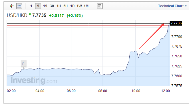 据华尔街见闻,港元兑美元扩大跌幅至0.17%,创2011年以来最大跌幅。恒生指数14日午盘收于19608.96点,半日跌1.63%。国企指数半日跌1.92%,报8331.409点,红筹指数半日