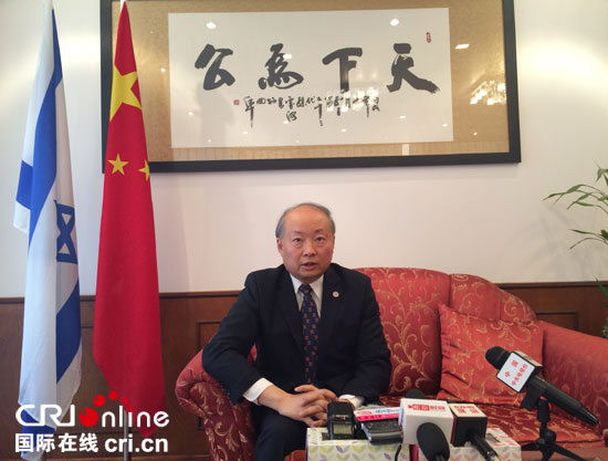 中国驻以色列大使詹永新接受中国记协“一带一路“新闻代表团采访。(摄影孙伶俐)国际在线报道(中国国际广播电台记者孙伶俐):由中国记协书记处书记王冬梅率领的“一