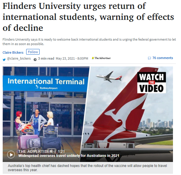 弗林德斯大学国际事务副校长雷斯科尔德(Sebastian Raneskold)表示,尽管澳洲最初关闭国境的决定,非常有效地应对了疫情,但留学生数量的下降将对澳洲经济产生重大的影响,并令各高校“深感担忧”。他说:“我们准备立即欢迎留学生返回,并敦促联邦政府迅速实现这一目标。”