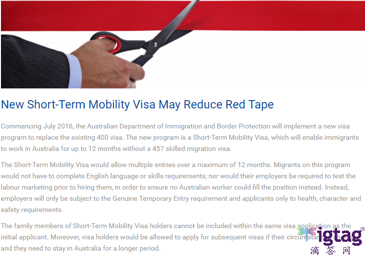 根据澳大利亚移民部公布的消息,从2016年7月起,澳洲移民部将开始实施一种新的签证类别:短期流动签证(short-termMobilityVisa)。短期流动签证将取代之前的临时工作